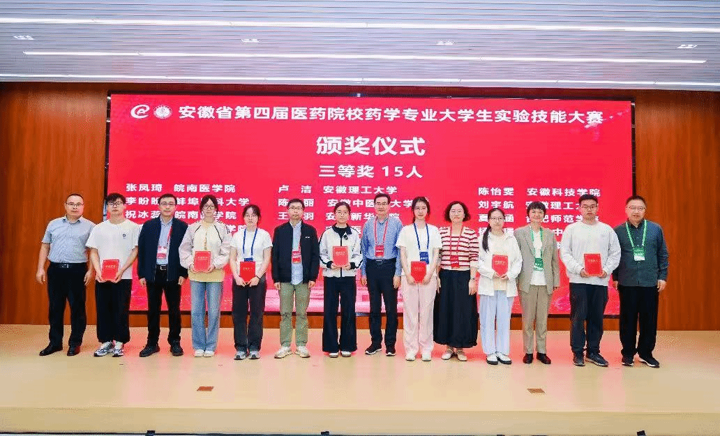 据悉,安徽省第四届医药院校药学专业大学生技能大赛汇聚了省内14所医药类及相关院校的师生参与,50名优秀选手经过校内选拔脱颖而出,站上省级赛场展开专业比拼。大赛分为实验理论考试与实验操作技能考核两个环节,全面考察参赛选手的专业知识储备与实践操作能力。在实验操作环节,大赛设置化学与药理学两大模块,创新采用“轮转双模块”竞赛机制,全面检验选手的综合实验能力与应变能力。