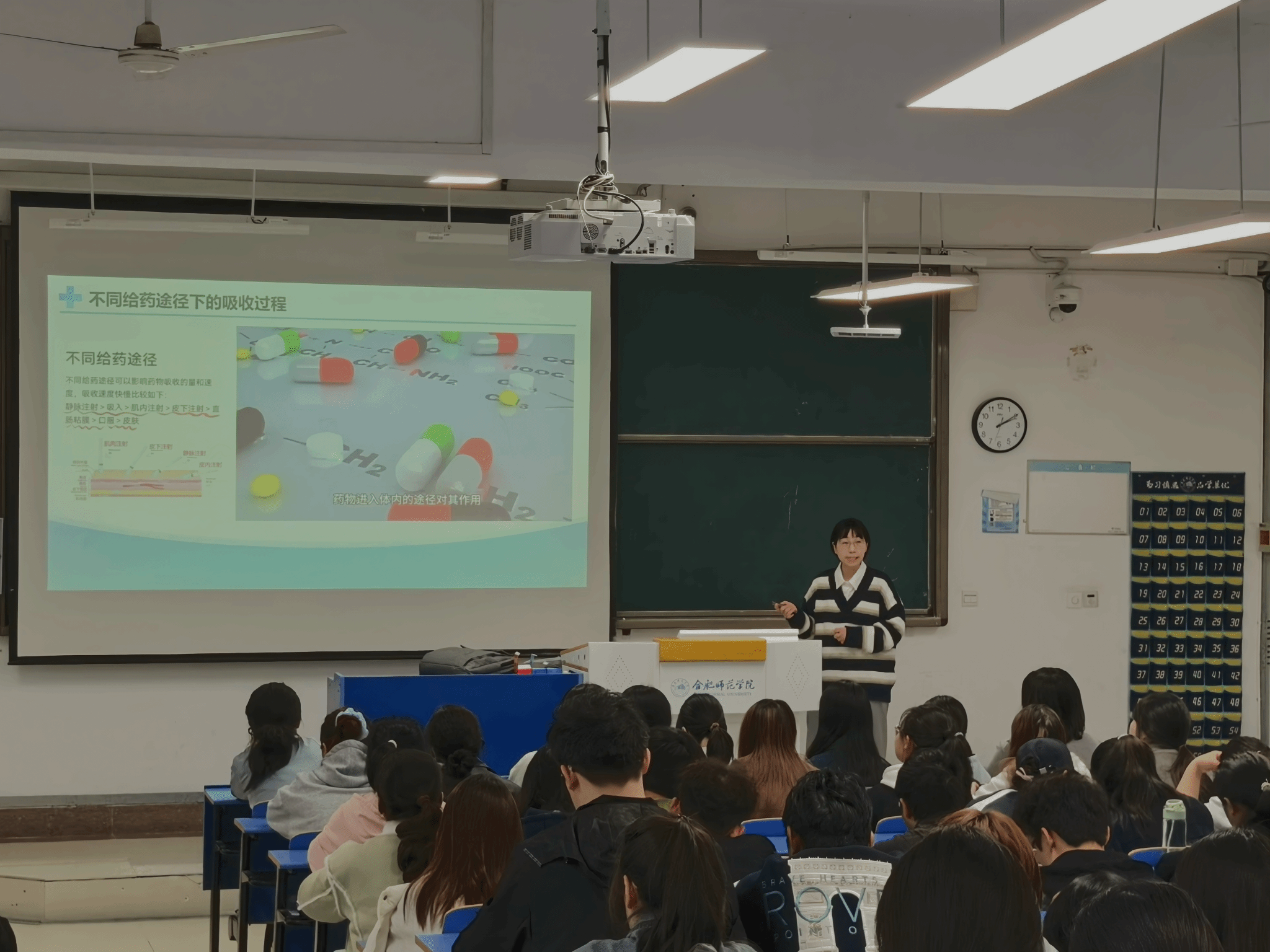 讲座开篇,卢璇博士以大众熟知的布洛芬为切入点,生动解构了药物在人体内的 “旅行轨迹”,并着重强调,药物治疗绝非孤立的干预行为,个体差异背景对治疗效果与安全性起着决定性作用,为整场讲座奠定了科学严谨的基调。随后,她系统拆解了药物体内过程的四大核心环节—吸收、分布、代谢与排泄。其中,吸收速度因口服、注射等不同给药途径呈现显著差异;而药物代谢环节中,细胞色素P-450酶的关键作用成为讲解重点,卢璇博士详细阐释了该酶非特异性、个体差异性及易受药物影响的特性,揭示其作为药物相互作用核心调控因子的重要意义,让在场学生对药物作用机制有了更清晰的认知。