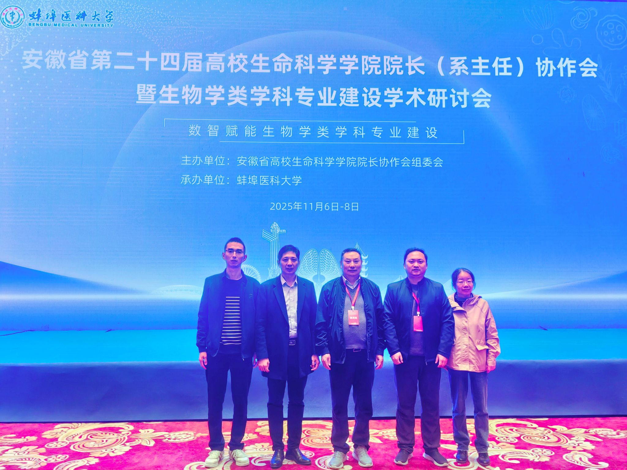 2025年11月6日-7日,合肥师范学院原党委副书记、副校长、安徽省大学生生物标本制作大赛专家委员会主任李进华教授、必威BETWAY官网副院长陈金武、实验室主任耿明、朱勇教授和张启信博士一行5人参加由安徽省高校生命科学学院院长协作会组委会主办、蚌埠医科大学承办的“安徽省第二十四届高校生命科学学院院长协作会暨生物学类学科专业建设学术研讨会”。大会以“数智赋能生物学类学科专业建设”为主题,来自全省21所本科高校的100余位院长、系主任、专家学者及教师代表参会。